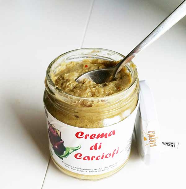 Il prosciutto è tagliato al coltello a listelline e la crema di carciofi abbiamo usato quella di Vivere la Toscana, prodotta solo con i carciofi del terreno del nostro produttore senza pesticidi o sostanze chimiche.